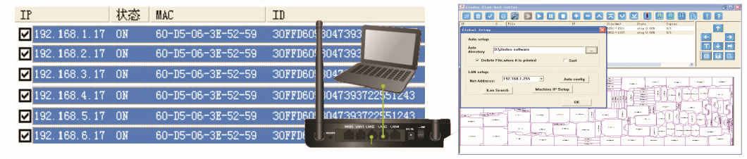 ⑥1. 一臺(tái)P C電腦通過(guò)路由器控制多臺(tái)噴墨切割機(jī);2. 國(guó)際首創(chuàng)超級(jí)終端切繪軟件,終端電腦可預(yù)覽、編輯在主機(jī)電腦中的各個(gè)排隊(duì)文件等;3. 主機(jī)切繪軟件實(shí)時(shí)動(dòng)態(tài)與終端軟件交流,檢查編輯噴繪切割中文件時(shí)無(wú)須電腦間來(lái)回走動(dòng)!