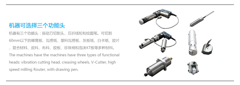 ◇ 配置振動刀、拖刀,筆畫工具以及可選配置半刀,銑刀,開槽刀,圓刀、壓痕刀等多種刀具,可實現(xiàn)寫字畫線、虛線裁切、半斷裁切、全斷裁切、銑刀裁切、多種材料V-CUT開槽、開銑槽、大小壓輪壓痕、硬質(zhì)材料刮痕等實用功能。